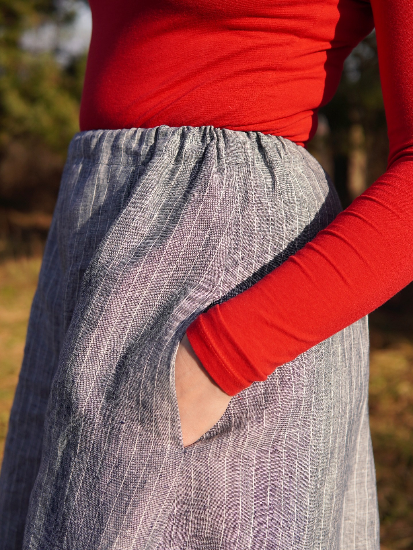 V téhle lněné kalhotové sukni v midi délce si budete připadat jako v sukni, ale přitom se nemusíte bát, že vám ji vítr nadzvedne, můžete si s klidem sednout do tureckého sedu nebo jezdit na kole, zkrátka spojuje výhody kalhot a eleganci a vzdušnost sukně.