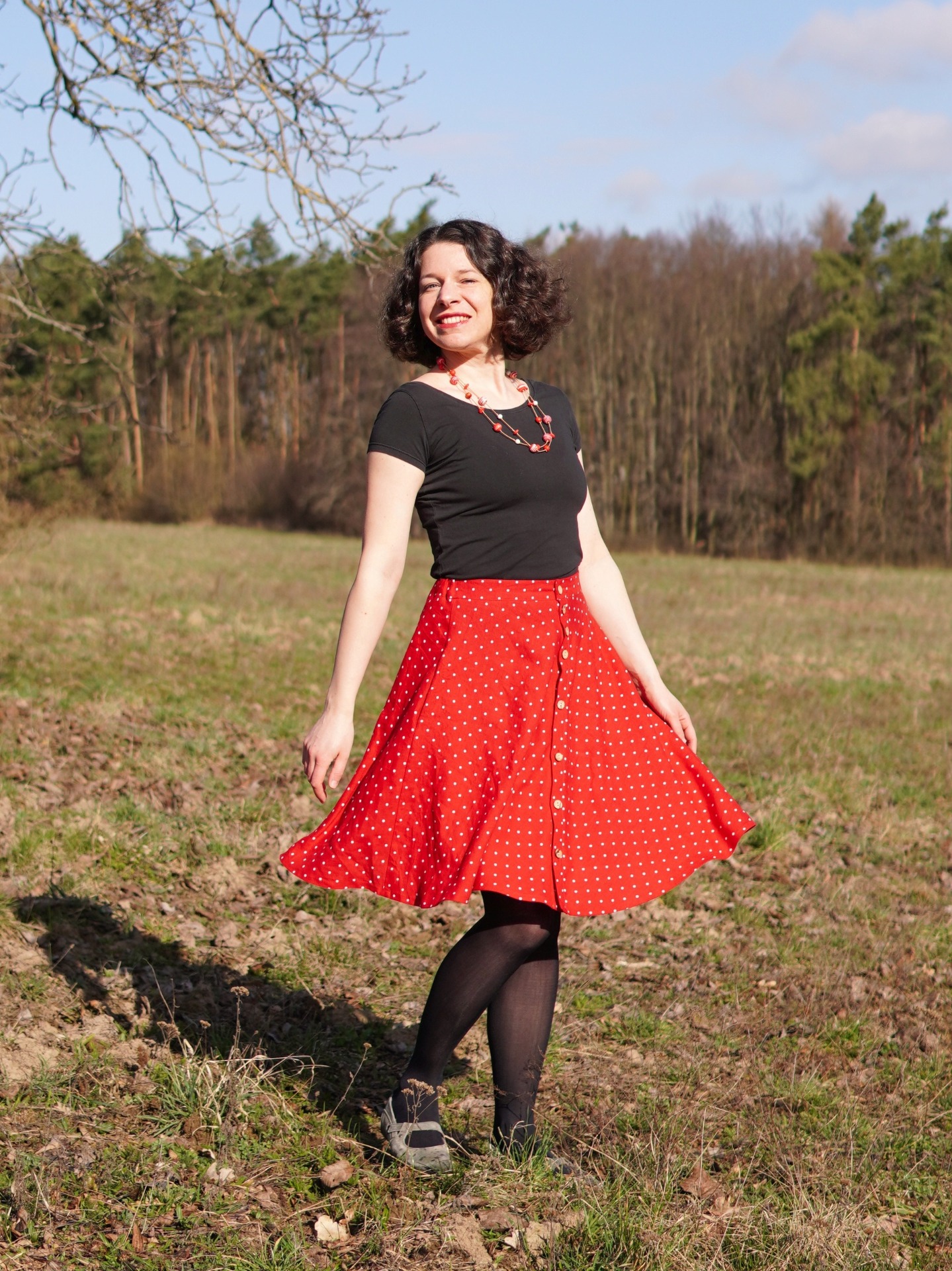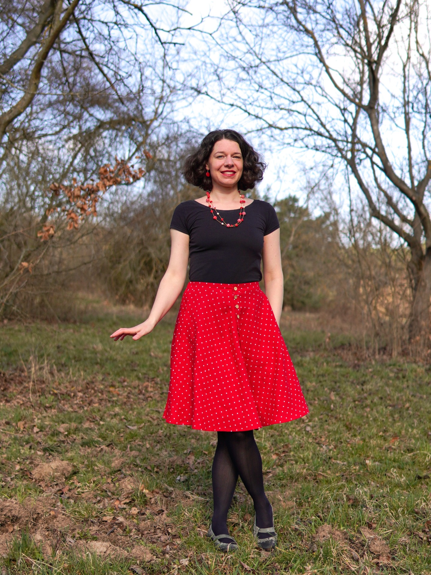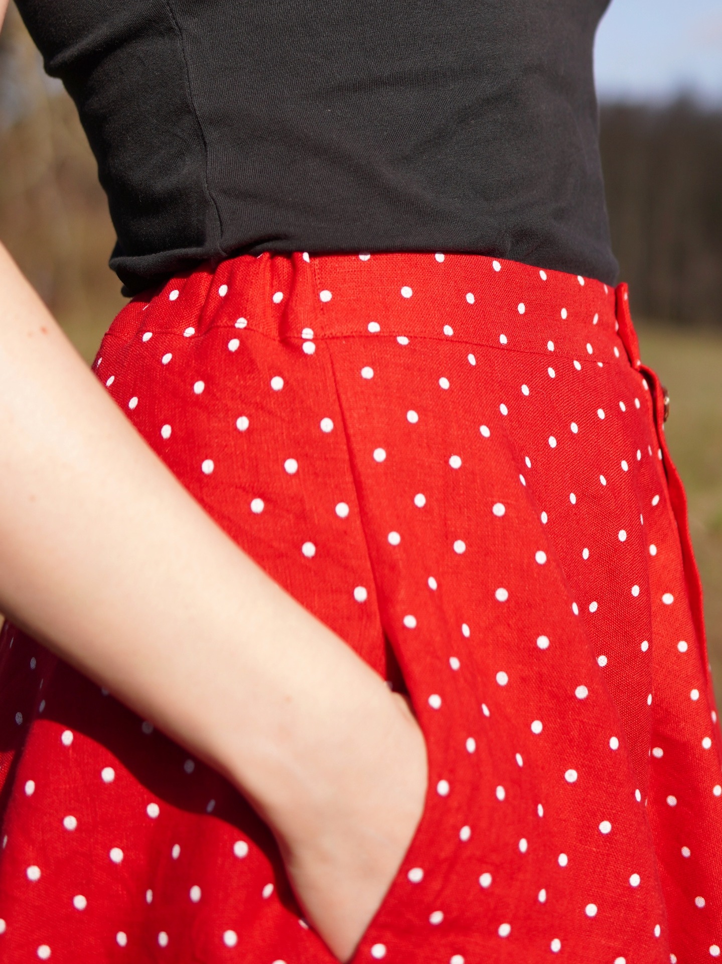 Půlkolová propínací sukně - červené puntíky