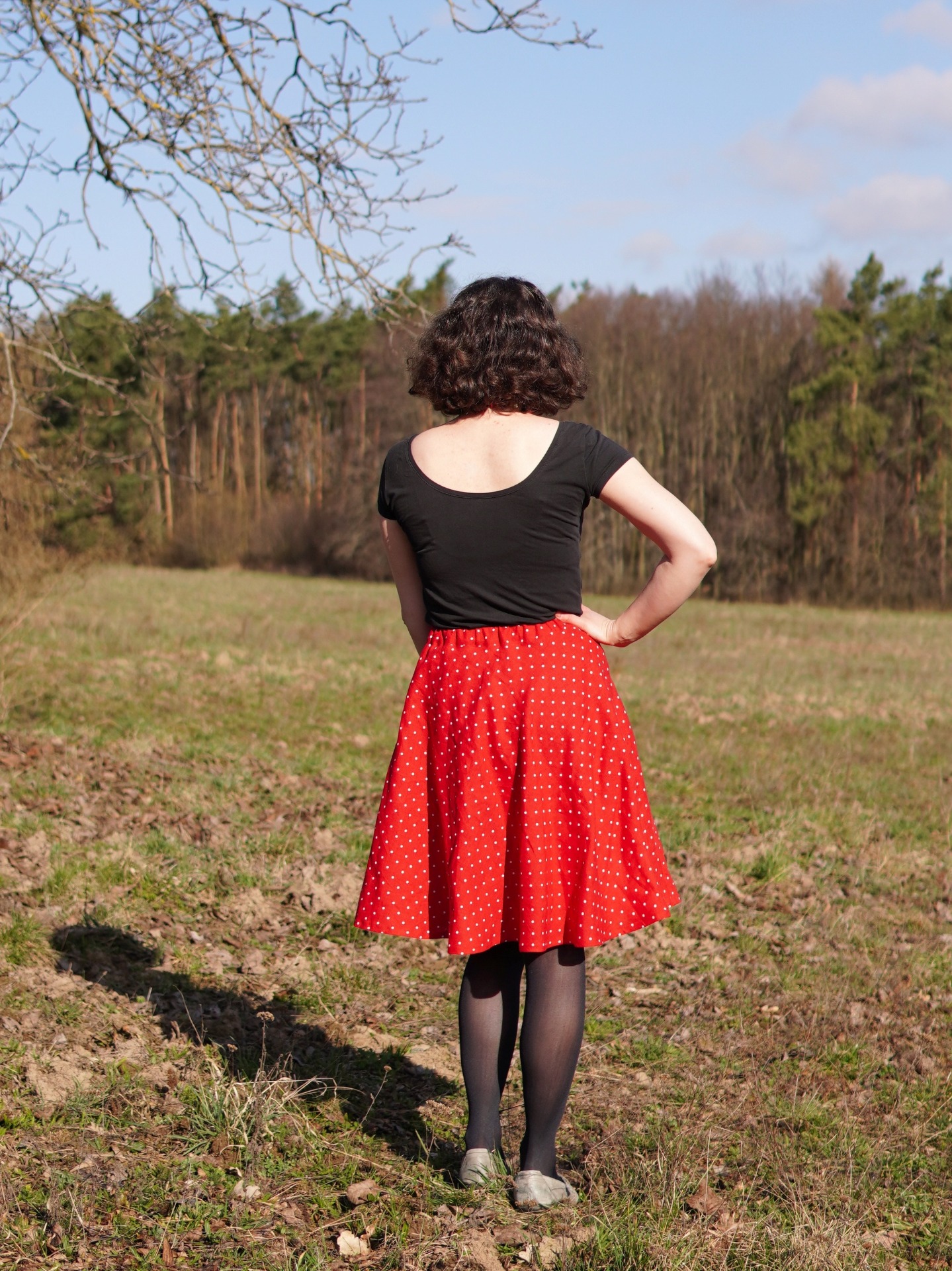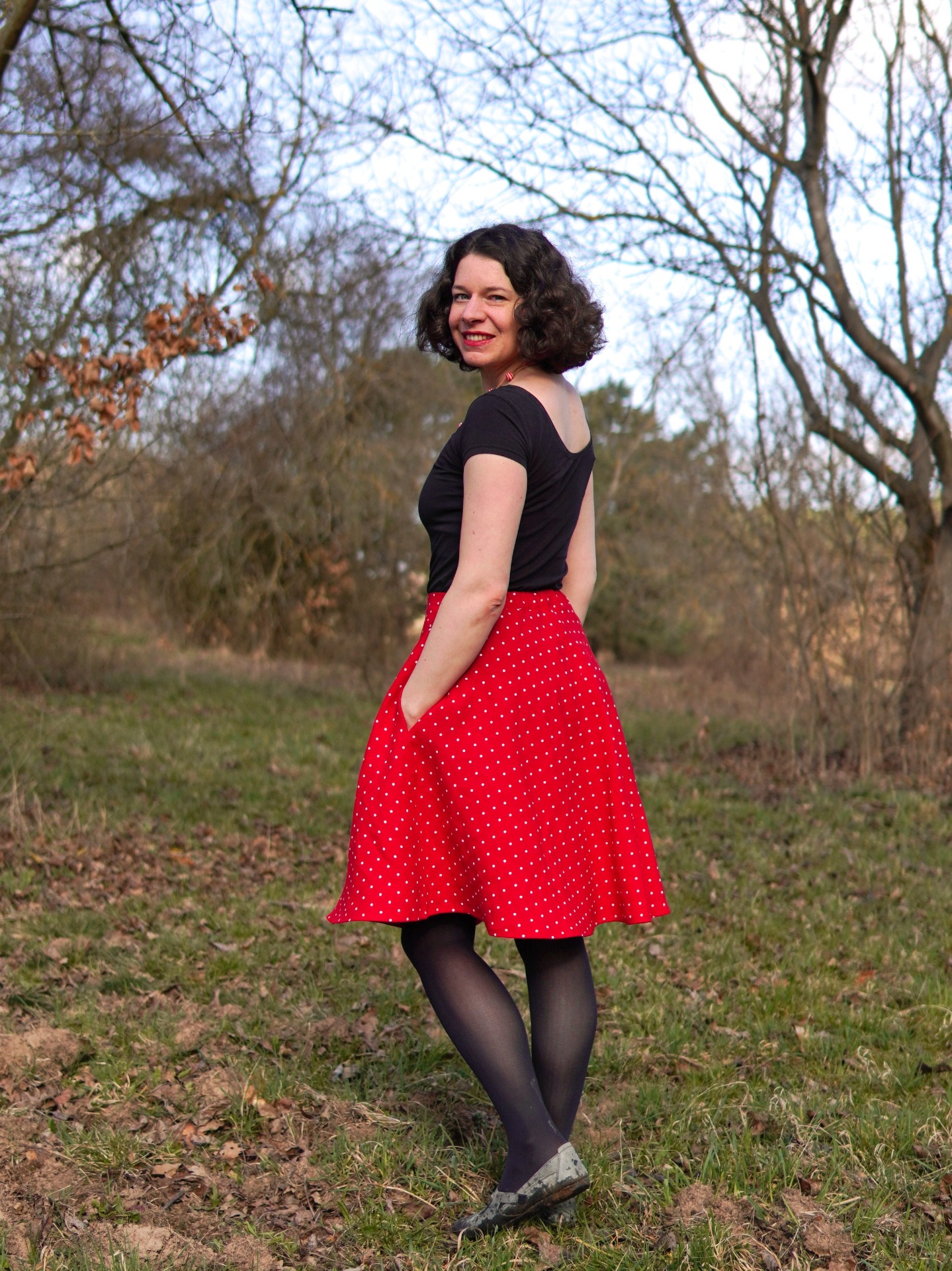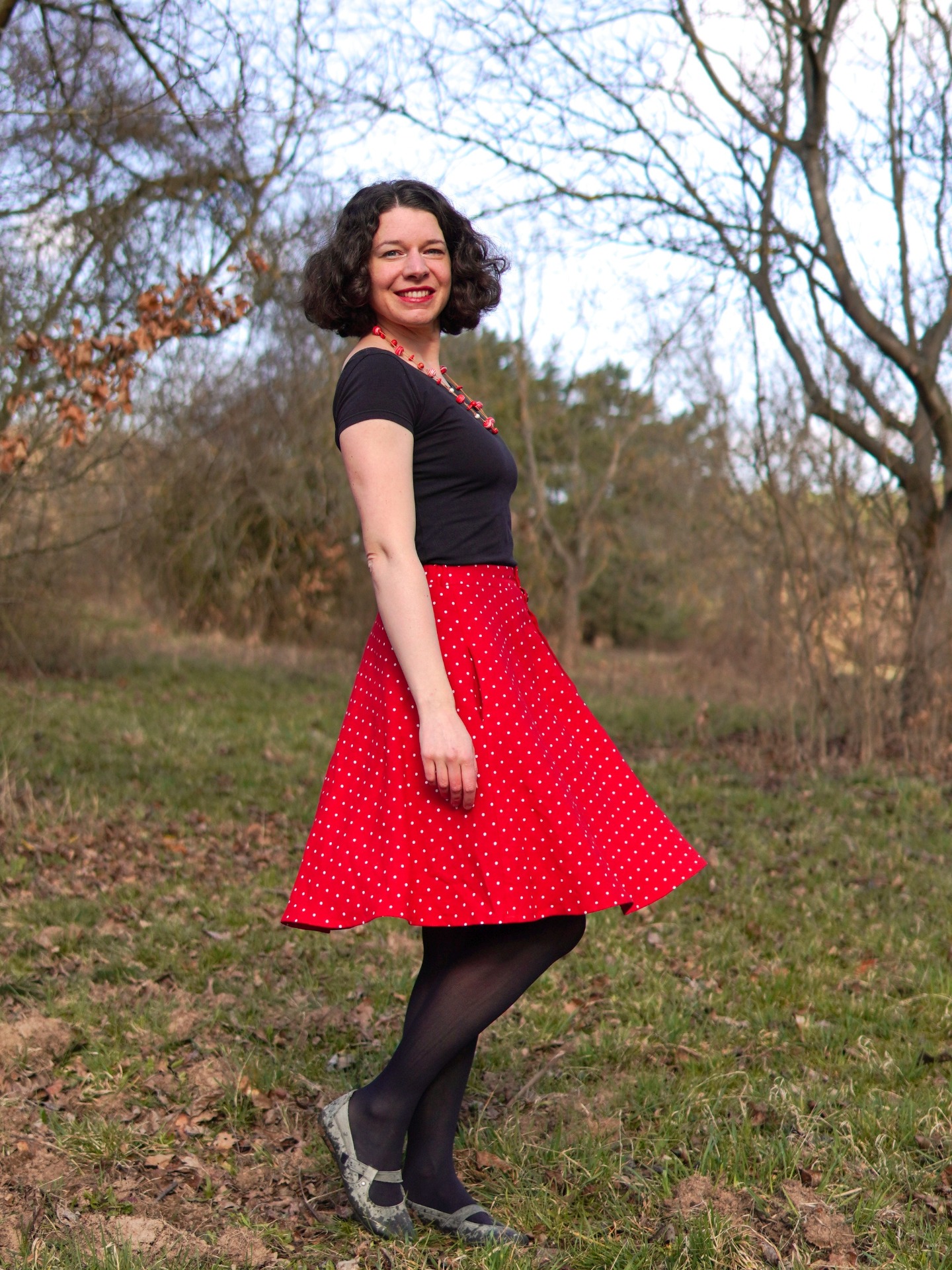 Půlkolová propínací sukně - červené puntíky