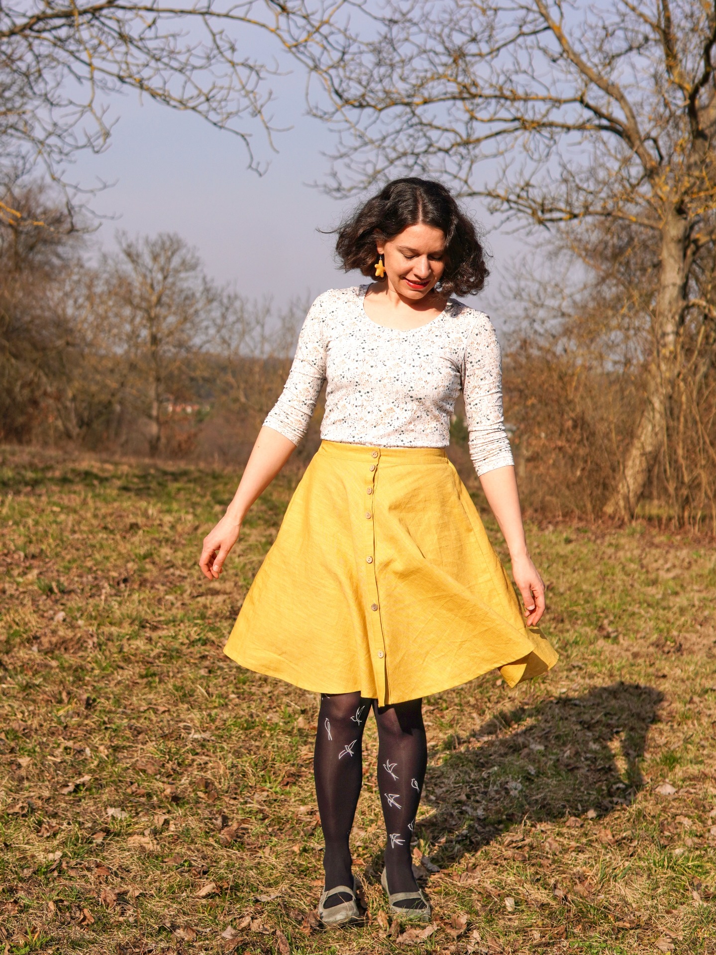 V přední části je pas pevný a sukně se zapíná na kokosové knoflíčky, v zadní části je v pase guma.