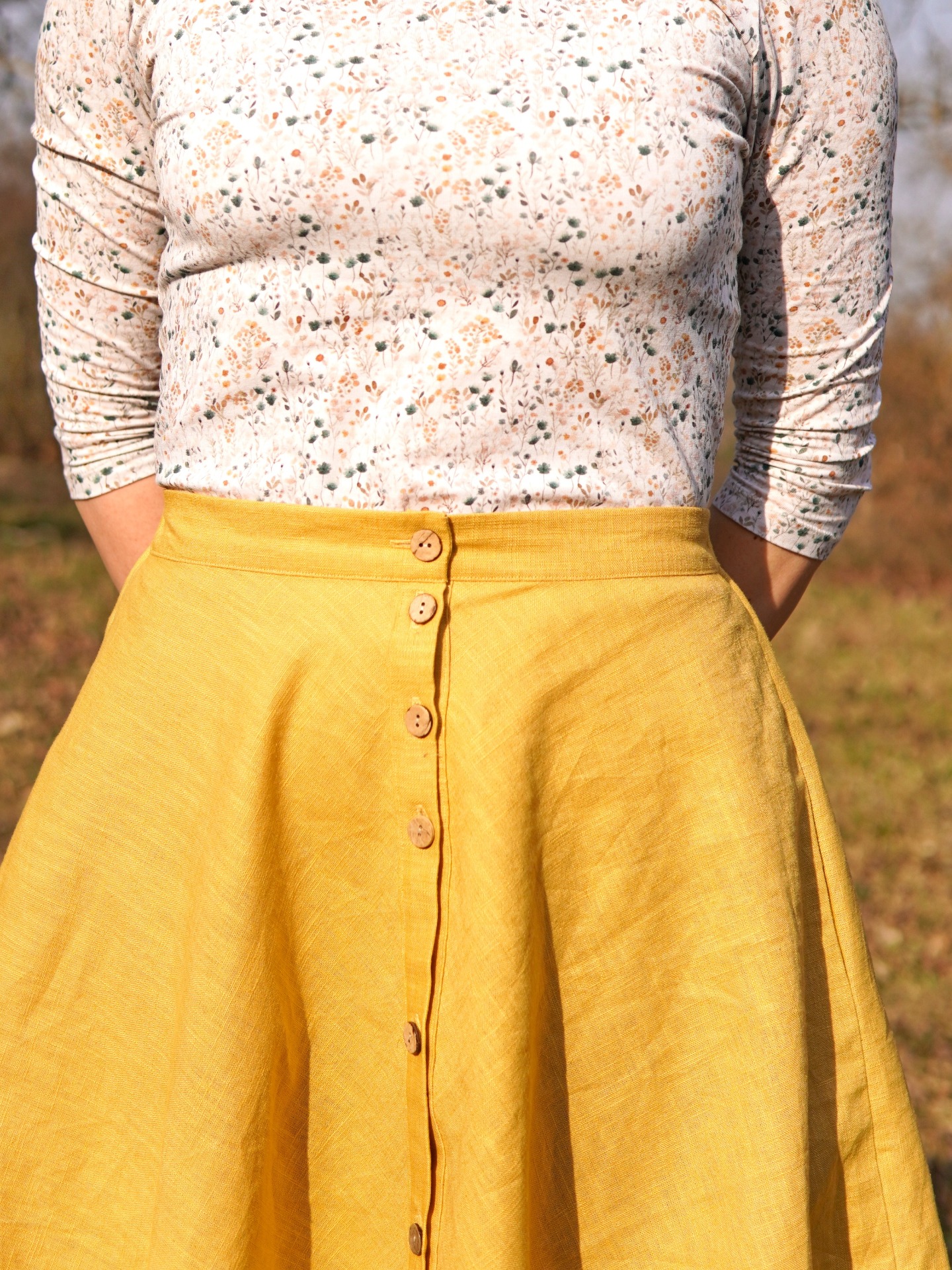 Lněná propínací sukně v půlkolovém střihu, která je elegantní a zároveň pohodlná.