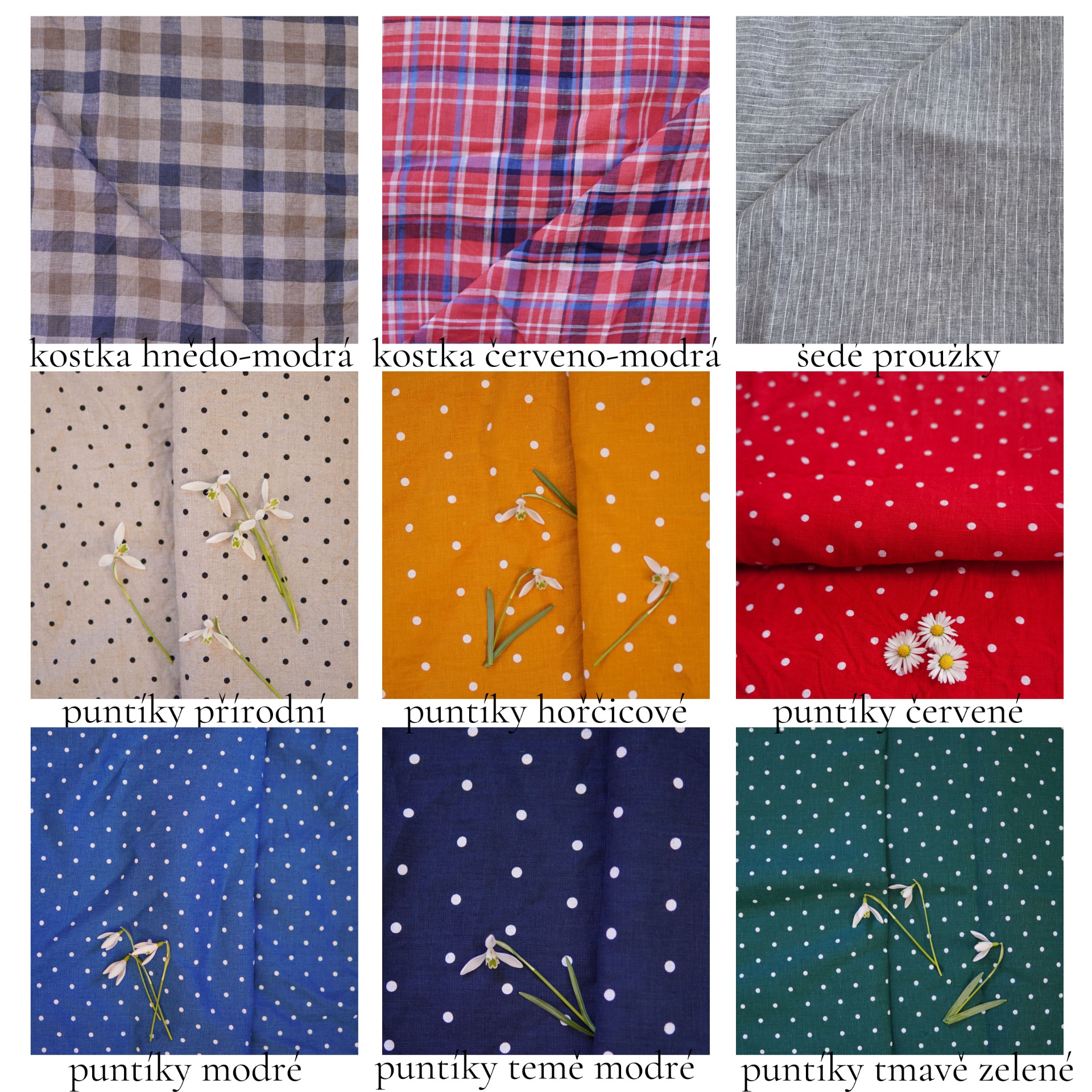 Všechny látky jsou 100% len, ale v různých tloušťkách, proto se ne všechny hodí na všechny kousky.